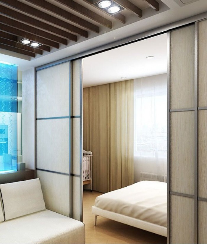 Один из лучших способов — раздвижные межкомнатные перегородки. Они позволяют разделить кухню и спальное место, не теряя при этом света и ощущения воздуха.